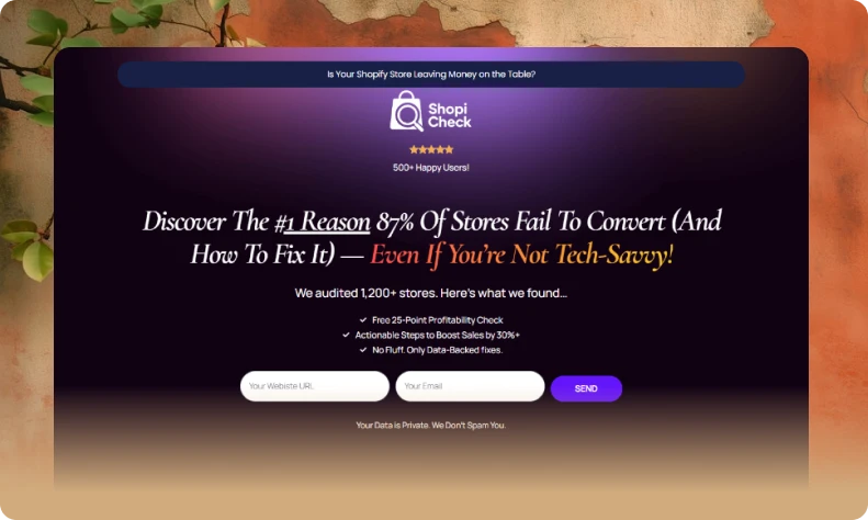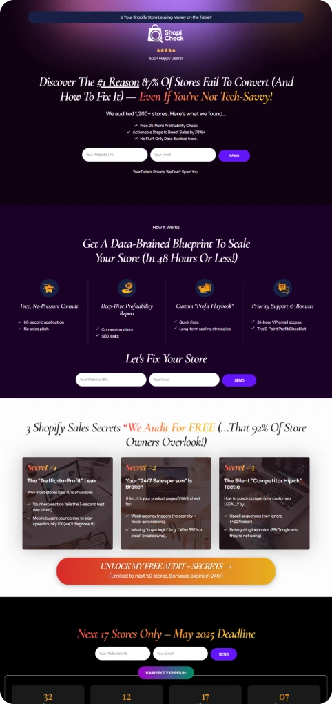 This audit page leverages urgency and data-driven hooks but needs sharper visual hierarchy to guide users. We’d simplify the ‘3 Secrets’ into icons, move bonuses above the fold, and test a lead magnet (e.g., ‘Free Traffic-Leak Calculator’)