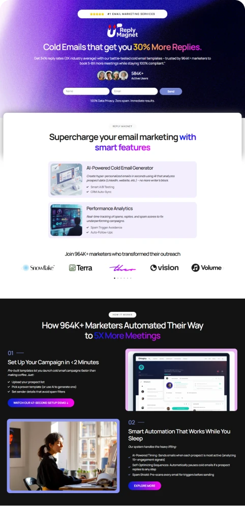 This email tool page leverages AI and proven results well, but could convert 20%+ better with a stronger CTA hierarchy and role-filtered testimonials.